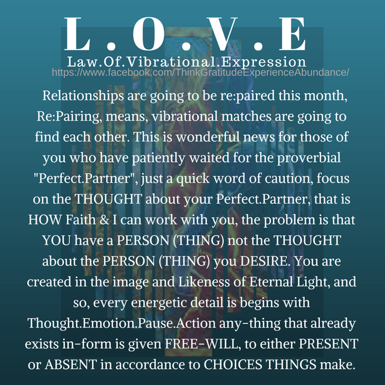 - Relationships are going to be re:paired this month, Re:Pairing, means, vibrational matches are going to find each other. This is wonderful news for those of you who have patiently waited for the proverbial “Perfect.Partner”, just a quick word of caution, focus on the THOUGHT about your Perfect.Partner, that is HOW Faith & I can work with you, the problem is that YOU have a PERSON (THING) not the THOUGHT about the PERSON (THING) you DESIRE. You are created in the image and Likeness of Eternal Light, and so, every energetic detail is begins with Thought.Emotion.Pause.Action any-thing that already exists in-form is given FREE-WILL, to either PRESENT or ABSENT in accordance to CHOICES THINGS make.